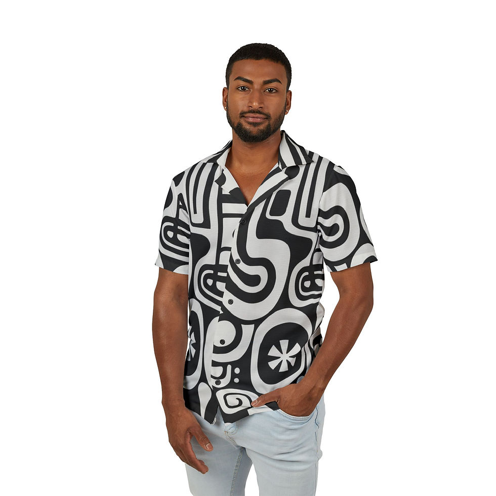 Retro 50's Black and White Absract Men's Hawaiian Camp Shirt