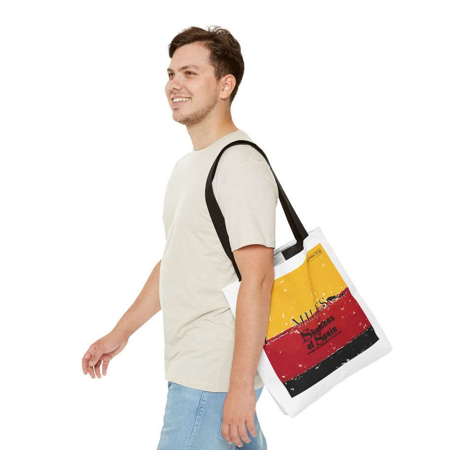 This Miles Davis 'Sketches of Spain' Tote Bag comes in various sizes and is made with 100% polyester, a highly durable fabric perfect for everyday use. The black inner stitching and reinforced handles add extra strength and style. The boxed corners create more room for your belongings. With 5 handle color options and 3 size choices, this tote bag is versatile and stylish, perfect for jazz music lovers and art enthusiasts. Ideal for everyday use, gift-giving, and music-themed celebrations.