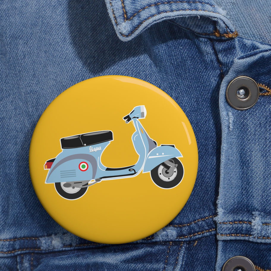 Vespa Yellow Pin Button. Made from metal, yet are lightweight and durable with a strong safety pin.